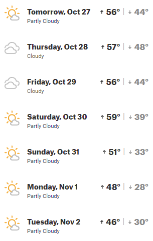 This looks to be another unseasonably warm week and Drury Outdoors’ Deer Cast is predicting that the next few days will be anywhere from OK to poor to bad. Not sure what the difference is between bad and poor since neither sounds particularly appealing, but according to their scale bad is worse than poor. Either way, it’s supposed to start getting down to freezing overnight again on Saturday night, and not surprisingly, the best hunting days for this area are projected to be Sunday and Monday. If you can sneak in a trip to the woods while the kids are trick or treating on Sunday that sounds like the way to go.