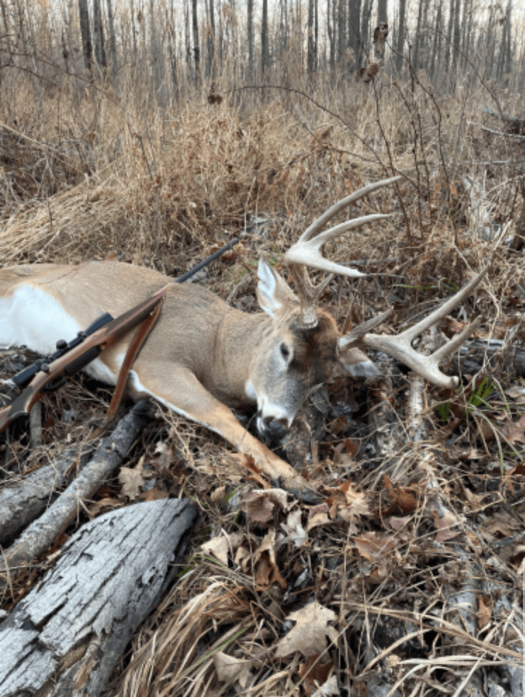“Shot the afternoon of November 23rd in the Wisconsin Rapids area. Was a slow evening when I caught movement of legs coming out of the brush about 125 yds away. After seeing his head, I knew he was big, but didn’t realize how big until walking up on him after I shot. Gave me a 60 yard shot and died 35 yards in front of me. Dressed out at 180 lbs.”