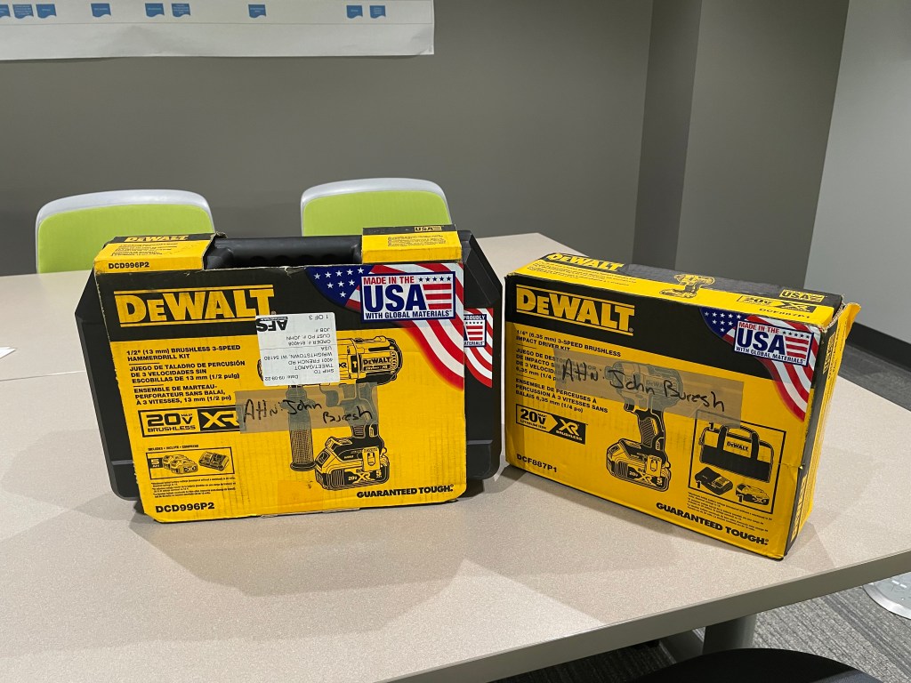 Hunter Tingley was the winner of the cordless drill and Devin Evers won the impact driver. Hunter is a Local 400 plumbing apprentice currently working at Sister Bay Clinic. Devin is also a Local 400 plumber and he’s working at our Neenah High School project. Congrats to both of you, and thanks once again to Cory Tingley at AFS for the great prizes!