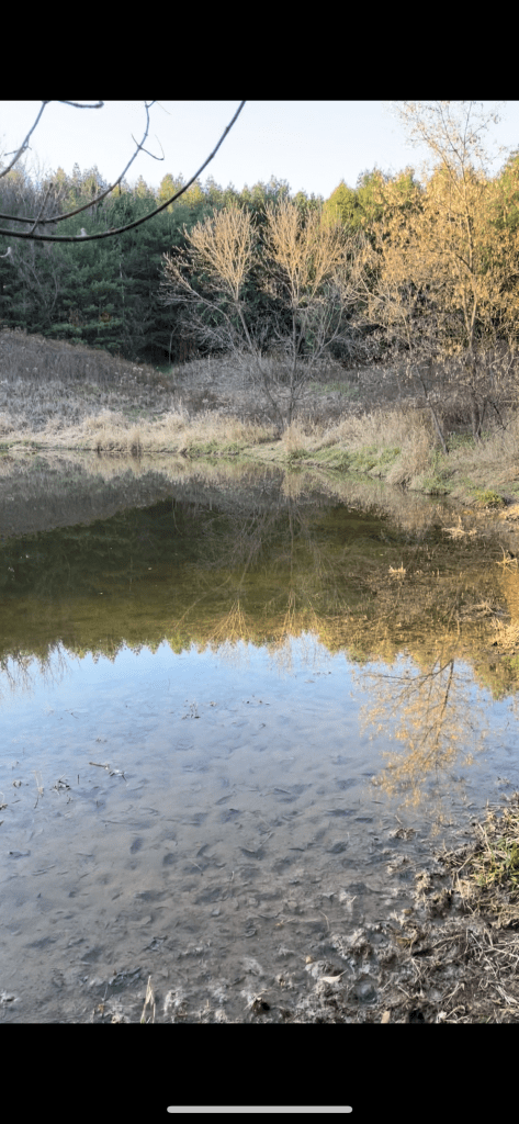 I was with a group of buddies and my brother in on public land. Things were pretty slow the week we were there as the rut wasn’t quite happening and the weather was warm and raining. To make things worse, the pressure from other hunters was even worse on any deer sightings. After seeing lots of scrapes and rubs all over, we chalked it up to the deer being nocturnal yet. My other buddy Mike was having luck on seeing this buck for 3 days in a row so on the last day, he came up with a plan to try and get an arrow in him. Mike set up where he was seeing him every day and he put me in a spot where he thought he was headed. The plan worked out as Mike had him coming in like it had been but he couldn’t get a shot. Mike texted me to try a doe bleat and sure enough, he headed my way. When he came in I realized this wasn’t the type of buck I was after but after the long week of scouting/hiking up mini-mountains, we both decided to fill a tag and not go home empty handed. The buck came in to a watering hole I was sitting on and at 40 yards, he turned broadside and I took the shot. It ended up passing thru both the lungs and stuck in the ground behind him. The buck ran 60 yards and dropped. Our plan worked and we were both excited except for the fact we had to drag him out a mile and a half to the truck. We had a great hunt and made many memories and are looking forward to trying it again next bow season! Below is pic of where the deer was standing and the tree across the pond next to the water is where I was sitting with my saddle and feet on the ground. It was a different feeling being at eye level in the open and being able to bring down a deer.