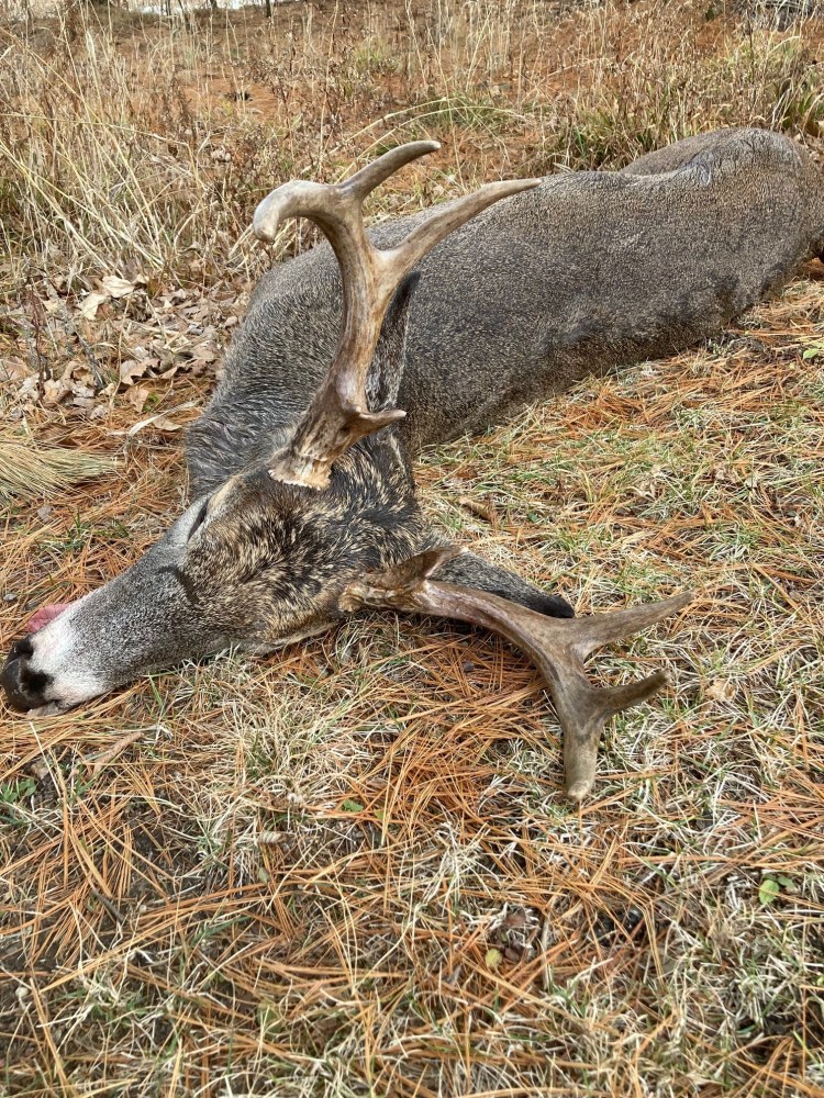 “Got this 9pt on Thanksgiving morning behind our house. Sat in solid fog for 3 hours before it lifted and I could see anything. Went into the house to get my “deer recovery” helper. I had shot a doe earlier in the season with one of my other daughters in the stand. Was a fun season!”