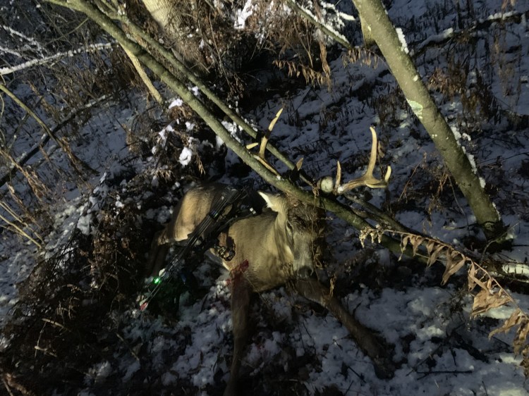 “I shot this 7 pointer November 16 . I’ve had pictures of this buck from early summer to the day I shot him. A week prior my father and I both seen him while hunting but never came in close enough. That Wednesday I got out to the stand after work knowing I was taking a chance with the short time frame to hunt until dark. But he showed up 40 min after I got to the stand . He stood at 28 yards for 10min facing me eating in the food plot finally turning broadside I took the shot and punched threw the shoulder. He ran roughly 80 yards to the woods and piled up 18 1/2 spread. Oconto county private.”
