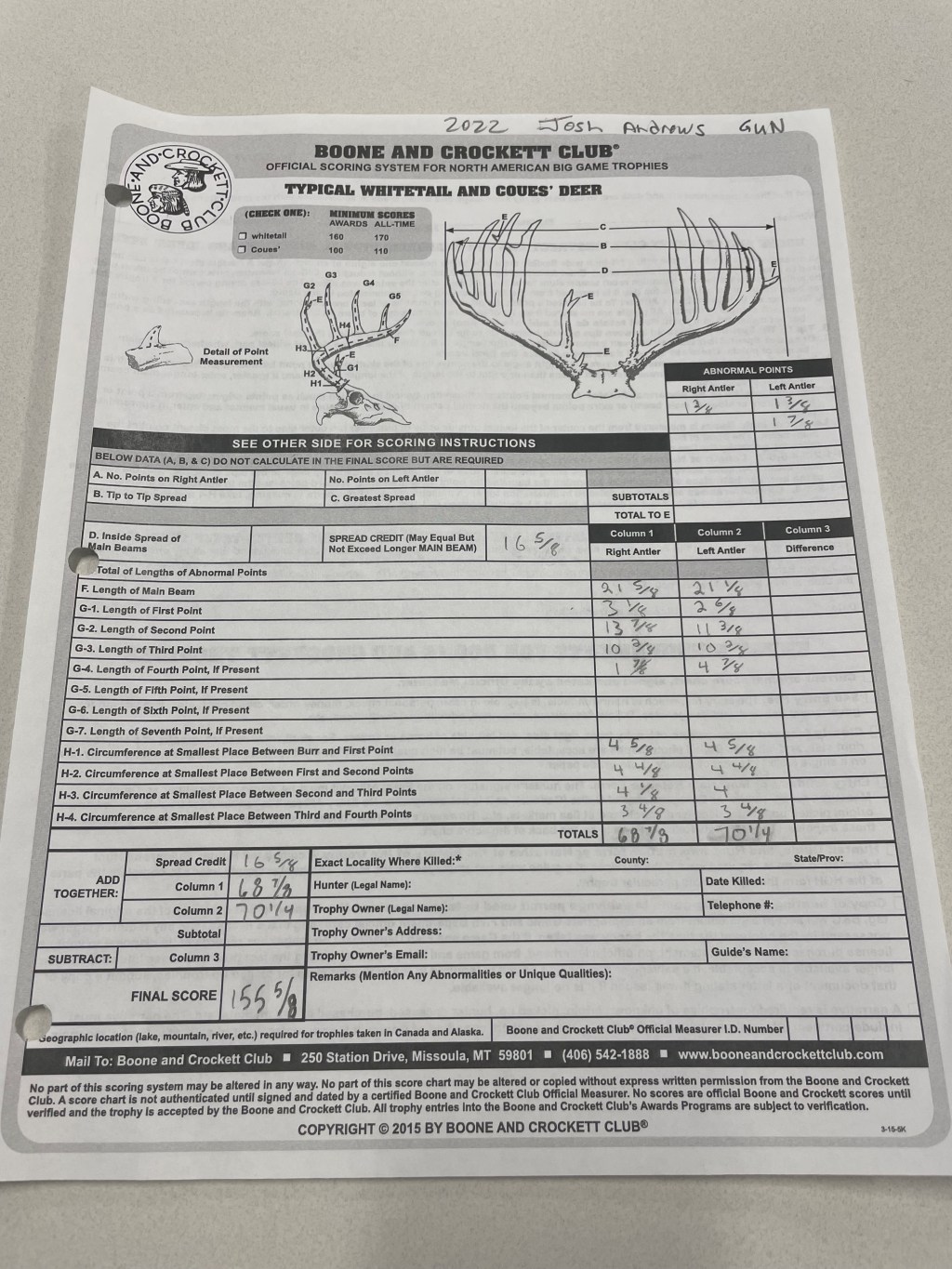 Congrats to Josh Andrews on a new Buck Pool record with a score of 155 5/8″!! Josh was able to bring in the rack at the De Pere location and I can tell you that the pictures didn’t do this buck any justice! I’ve put tape to many deer and I’ve never had any tines measure over 12″ and he had one measure 13 7/8″! Pretty awesome buck and thanks for bringing it in to the office for all to see!