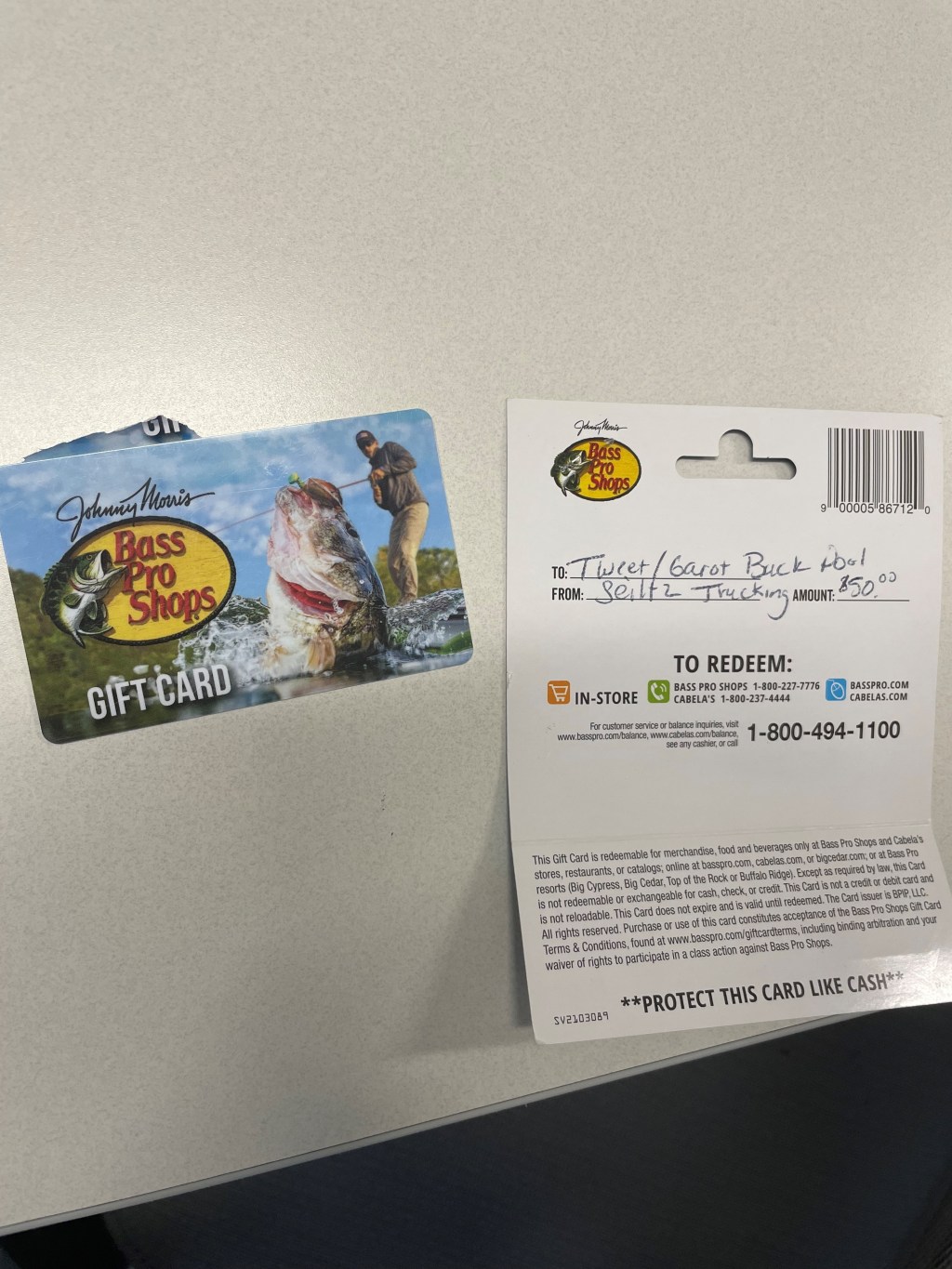 Our raffle prize for Week 11 (We didn’t have a Week 10 because we gave out prizes every day that week) of the TG Buck Pool is two $50 Cabela’s Gift Cards courtesy of Bill Seiltz at Seiltz Trucking. Two prizes = two winners. Here’s the video: