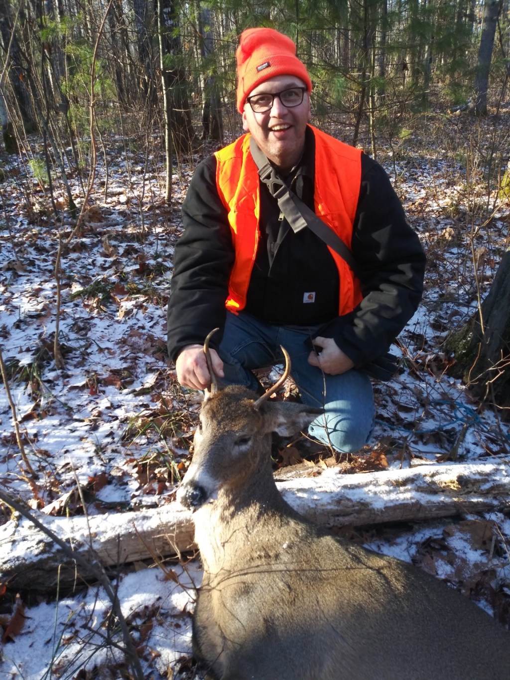 “So it happened on my last weekend to hunt.”So it happened on my last weekend to hunt. I got into my stand about 530am, at about 7am the neighbor dog was barking non stop for 15 minutes. I thought the day in that stand was going to be over. So my thought was to sit until 8am and then regroup and go try somewhere else. As time approaches I’m getting ready to pack my gear up and move, I see a doe walk in, then get chased out by this buck. So I grab my bow and he gets spooked and darts off. So I’m watching him slowly walk back and I draw on him waiting to walk out from behind a tree. As he walks forward I fire my bow, as that happens he jumped and turned at the last second. I shot through his abdominal area through his liver into a lung. I get down from the stand to see if i can find a blood trail and didn’t find a thing. Shot him at 8am and recovered at 2pm had to do a grid pattern throughout the woods to recover him. What a day! Not a good way to shoot my first bow buck but it all worked out!”