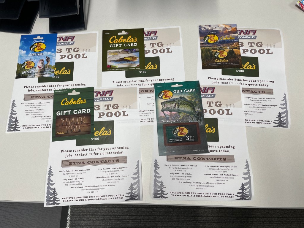 We don’t have all of the prizes in the building yet, so Jeff picked one from the collection at his desk. This week we have FIVE $100 Cabelas/Bass Pro Shop gift cards courtesy of David Potgeter and Toby Morris at Etna Supply Company. No, we’re not giving one person $500. We’re giving five people $100. Here’s the video: