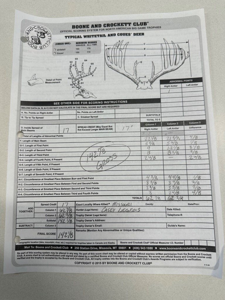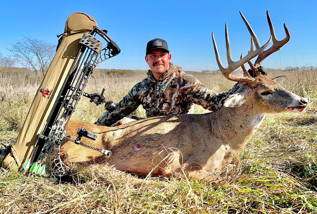 Casey, yet again, took down another buck shortly after harvesting his buck in Iowa! He made his way down to a property in Missouri that he was able to hunt. The property looked good so he set up in a spot for the next morning hunt. He snuck into the stand set in the morning toting his decoy along and set it up 25 yards away in a CRP field facing him. Right away at day break he had small bucks running through the creek bottom behind him. About 7:30 in the morning he spotted a doe working her way down the fence line with a nice buck following behind her. He let out a loud grunt to get his attention. The buck looked up and made his way down the fence line to a spot that he could cross. After the buck jumped the fence he made his way right to Casey’s decoy set. He gave him a perfect quartering away shot and Casey made it count. The buck snow plowed through the CRP field to the fence and crashed right at the fence line. Congrats on yet another great Pope & Young buck Casey! Casey’s Missouri buck ended up scoring 142 1/8″!