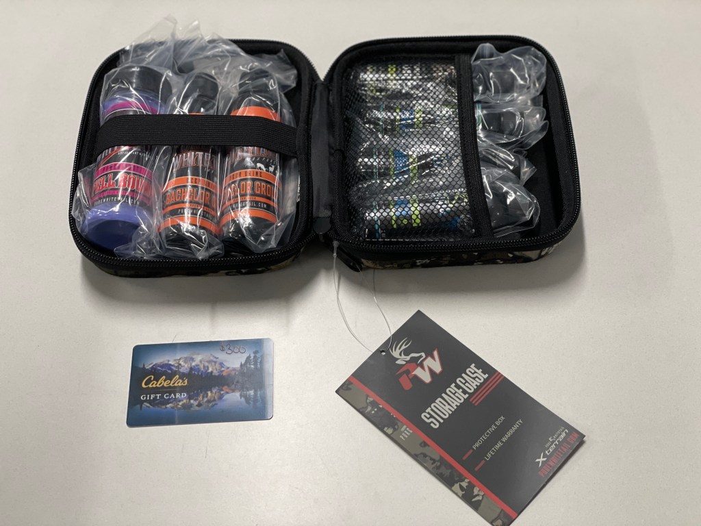 One more prize to get us caught up. The week of October 27 we awarded a prize on the podcast, but failed to post it on the site. As always, it was a damn good prize, so we don’t want this one to go forgotten or undocumented. This week there were two winners. Each winner received a $300 Bass Pro Shops gift card courtesy of Guy Adams at Design Air. And, as if that wasn’t enough, they also received a package of multiple deer hunting scents and a hard case courtesy of our friends at Pure Whitetail. Here’s another pic of the prize package: