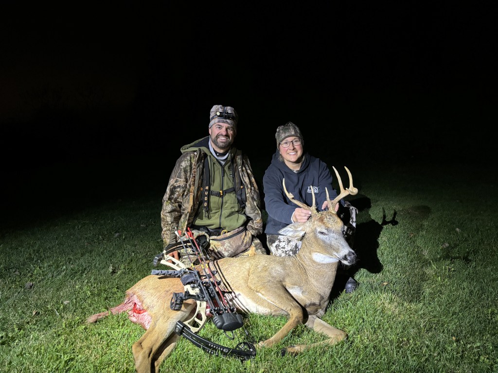 “Friday evening I sat in the stand where my wife shot her buck 2 weeks ago. Around 4:00 I saw a decent buck chase a doe into an area where I have another stand and a cell trail camera. I chose the wrong stand…. And then a little salt in the wound when I got a picture of him at 4:15 at my other stand. But I thought maybe they’ll stay in that area till morning… So this morning I sneaked into that other stand and by 7:00 I heard grunting. The doe then appeared and she started working towards me in the brush. The buck was very vocal the whole time grunting, snort wheezing, rubbing trees, posturing. The doe was now directly below me in heavy brush. But the buck then broke off the doe and bristled up to fend off another deer in the opposite direction. While working away from me he gave me a so/so shot at 35 yards that I decided to pass on, knowing I was now in between him and his doe, I didn’t want to chance the tough shot. Sure enough he turned back to his doe and crossed my shooting lane at 20 yards giving me a perfect shot. He ran 25 yards and tipped over. It was a great end to a lot of hours up a tree. And I got this all on GoPro, or so I thought. Turns out my GoPro shut down because of cold battery error after only 6 seconds… Aside from that it was a great encounter!”