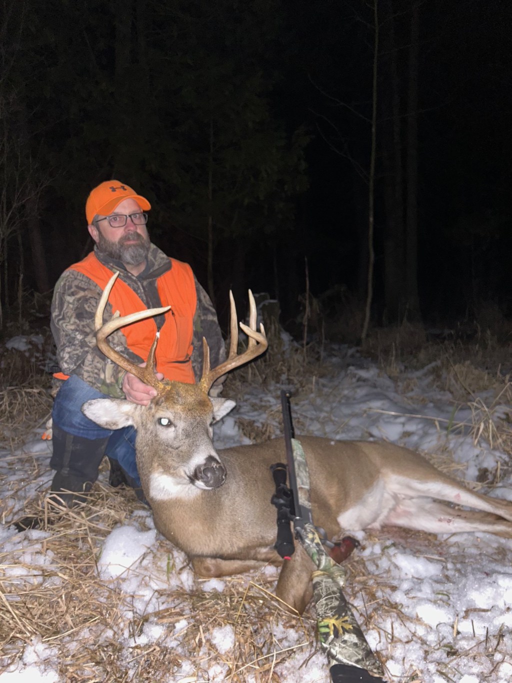 Congrats to Cory Veeser with his buck taken this week with the muzzle loader! Cory was able to get out in the woods after work because of a scheduling mishap with his dentist. It was perfect timing as this buck came walking in behind two does just before dark and stopped broadsided at 50 yards. He put up his CVA Muzzle loader and put this guy down in his tracks! By the looks of it, this buck was a fighter as the G2 on its right antler is busted off along with it’s G4. Still a beautiful buck and I’m sure it will fill the freezer quite nicely! Cory is an Account Manager working out of our Depere location.