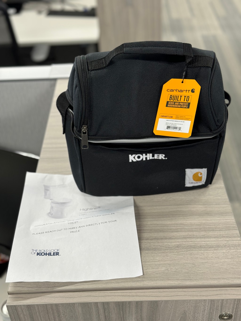 A few days late on this, but here’s the raffle prize from last Friday. A quick editorial: Most weeks I dread spinning the wheel because I think if my name comes up everyone is going to think that it was rigged. For the record, I’ve been in this pool for at least five years and haven’t won the weekly prize yet. Rarely have I wanted to win a prize as badly as this week’s. Today was one of those rare draws that I wanted to win. See, I have a couple of toilets in my house that I’d love to replace, and this week’s prize is a Carhartt Lunch 6-Can Cooler and a Kohler Highline Toilet courtesy of Mary Ann Christensen at Kohler. Here’s the video: