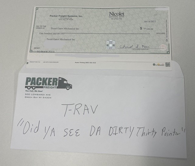 Prize #3 today is a check for $100 donated by Chad Mercier at Packer Freight. Let’s go to the wheel: