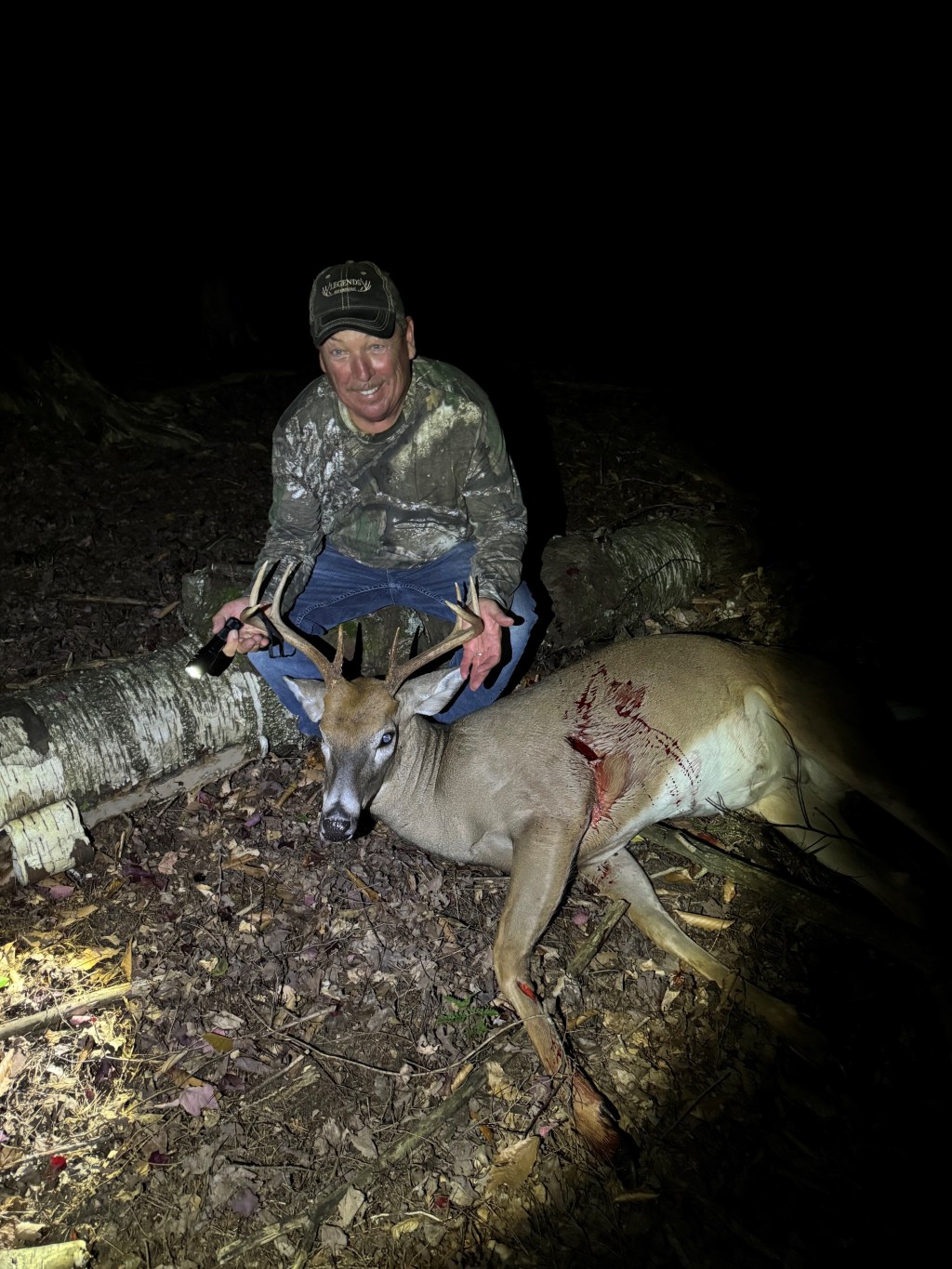 “He came in from behind and stayed behind me for about 10 mins. I couldn’t get a shot because there was a pine tree in between us. After that he backed up and disappeared. 10 Mins later a doe came in and she turned and looked back and there he was coming in. But he still stayed behind me. So, I had to grab my 10pt Crossbow and line him up for a shot right-handed. (Normally I shoot left-handed.) He finally stepped out and old Legend let him have it. After making a few phone calls, I was able to get a hold of Brian Mier to help track the Buck. If it wasn’t for Brian, we wouldn’t have found it, he ran about 200 yards. Legend’s Buck Mineral works!”