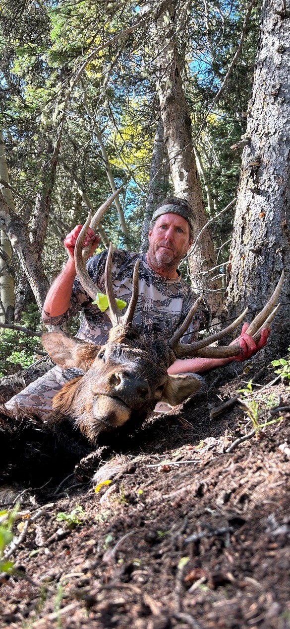 The hunt started out great with an encounter the first day with a good 5×5 which I had called in twice within 50 yards. But as we all know it doesn’t always work like it does on edited TV version. Tim Skenandore and myself had a few opportunities throughout the two weeks, but on the second Monday it all came together with a 5×5 bull that got sidetracked following some cows up over a pinnacle at 11,000 feet. I was working my way up and over the top to hunt the drainage that lay to the northeast back side which had better grass and water due to the dry summer/early fall. Tim had put this program together and had seen several bulls in the last few days on the back side. Working my way up that morning at 9 AM I had dropped a couple sequence calls on the pinnacle flats on the way up. Approximately 11,000 feet. That’s when the bull presented himself at 28 yards following some cows into the dark timber (More Details at another time). After receiving the Muzzy 3 blade the Bull went about 60 yards before tumbling another 20 down about a 60 degree pitch into the black timber. Knowing Tim was a out and over the top approximately 3 to 4 miles away I broke the bull down (boned out) and double packed (two trips) back to camp. 1.9 miles as the crow flies. Every day in the mountains in September is a great day, but elk camp is a damn happy place with back strap on the grill and an ice cold beer in hand after a day like that.