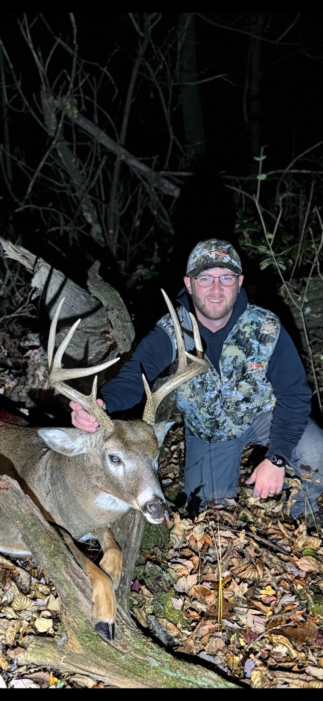 “Don’t have much of a story on this one, I went into this rut season with a couple bucks in mind but needed to get my eyes on them first. Had a pretty good sit the night of 10/26 and seeing this 8 and another 10pt pushing a doe on the neighbors behind me first thought on the 10 was he needed another year to mature and shortly after the 8 made his way up by me to get a drink and I was able to take a shot at 20 yards on this management 8.”