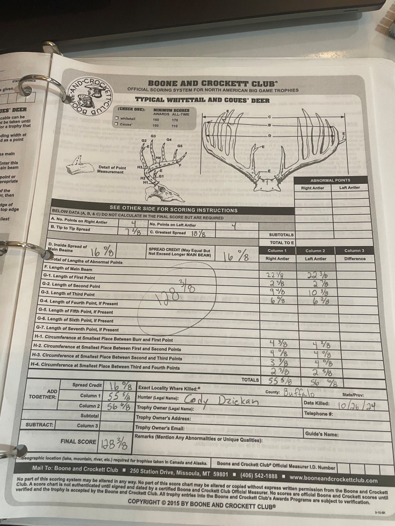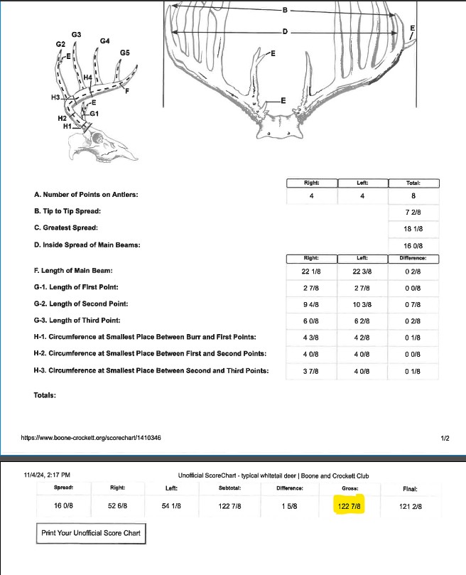 Correction on score, was missing the H-4 measurements. All bucks will always have 4 circumference measurements