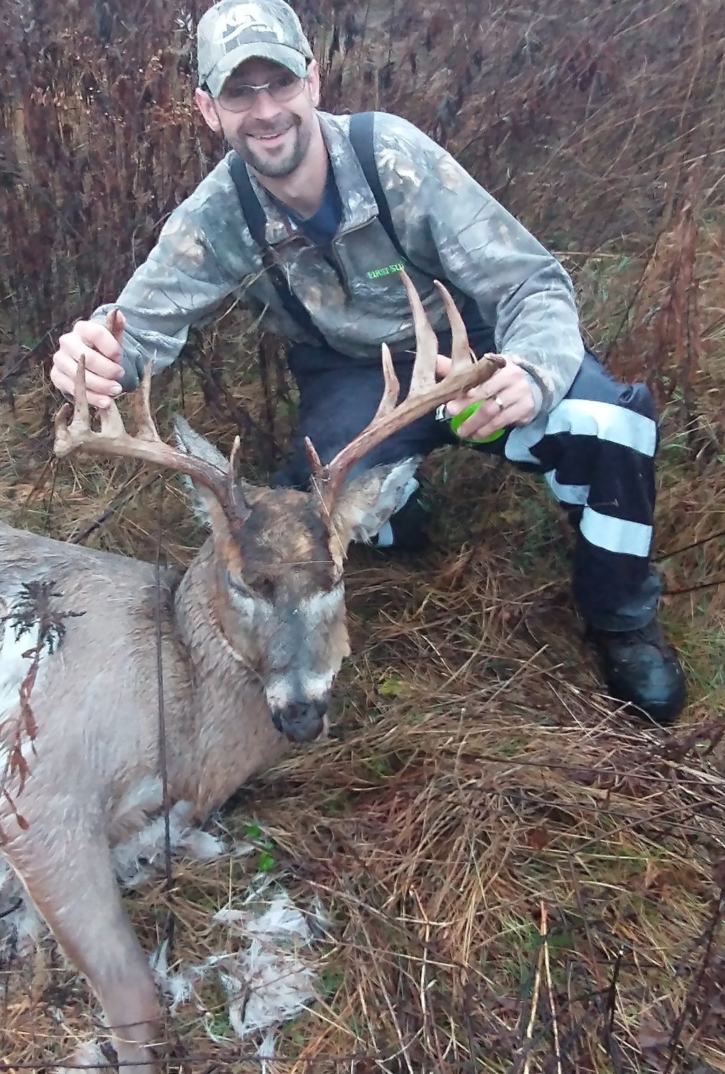 “It was an hour from dark, I had been in my stand for 20 minutes. This 11 pointer walks towards me, along a fence line, looking tired. He turned at the corner post and I hit him broadside at 25 yards. He jolted a bit, but 20 yards later he is just standing there. I climb down to the ground and put another arrow on. I creep towards him, hoping to get another arrow off. He starts down the trail with me following, trying to decide my next move. I see him bed down and back off, feeling confident he will expire soon.