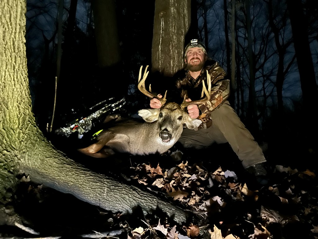 “Finally took down a 10 that I’ve been after for weeks. Didn’t expect anything since I didn’t get out till 3:30 yesterday afternoon and wanted to bait for Friday. At 4 I saw him cross the farm field so I grunted a few times but couldn’t see him anymore. I waited about 10 minutes and it came within 45 yards of me and I shot him. He went about 150 yards and fell.”