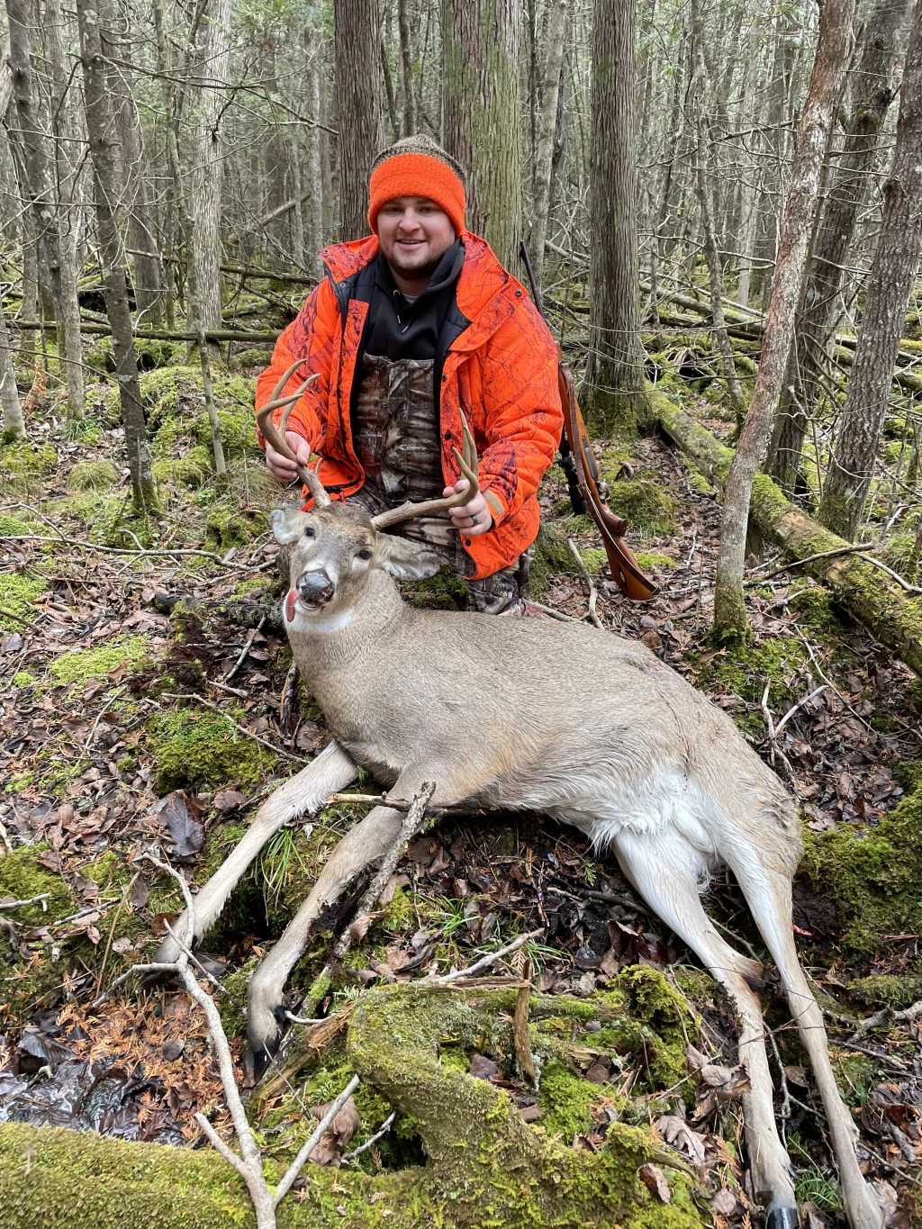 “Shot in around 11:20 on Sunday morning, didn’t see a single deer up till then. Saw some movement in the swamp and got the gun up, had 2 does move through a 1 foot shooting lane. He popped up in the cross hairs and had about 1 second to make the decision to shoot or not before it was gone behind trees and brush, put it right behind his shoulder and he ran about 40 yards.”