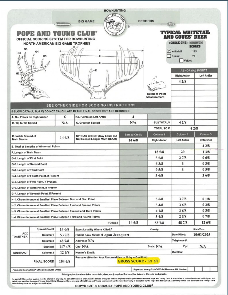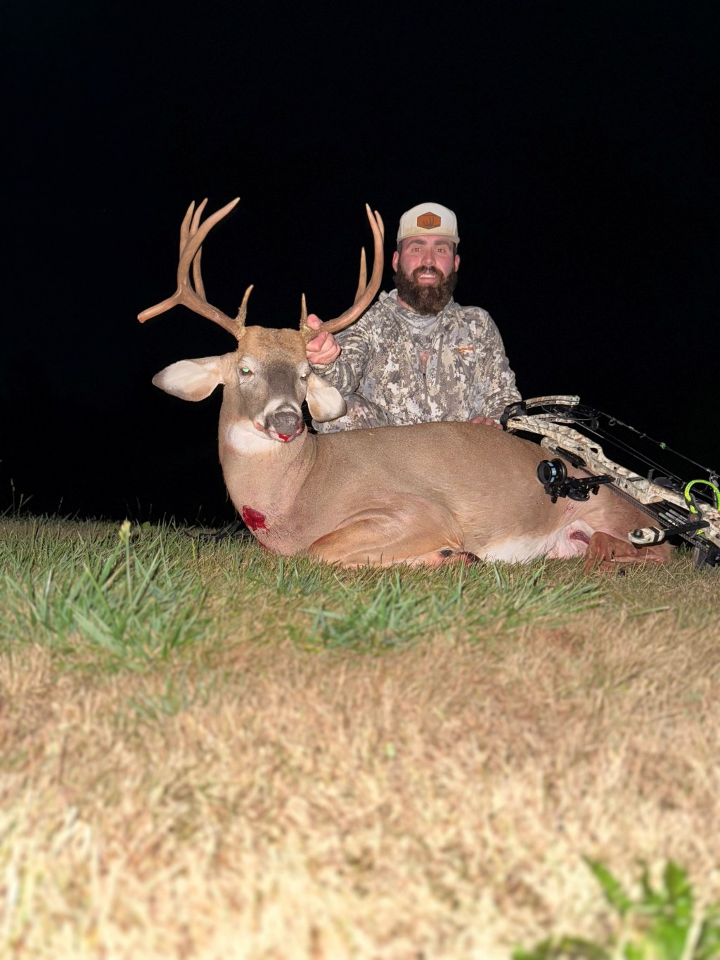 “We never had a picture of this buck up until about 20 minutes before I killed him. The picture was taken on the other side of the corn field that I was sitting in. I Figured it was going to go into the corn and never be seen again. Then, about 10 minutes later which felt like an hour, I seen the corn moving and sure enough, it was him! He walked out of the corn and headed my way towards a cedar branch that was overhanging the path that he was on. When he got behind the branch, I drew back my bow. When he stepped out, he lifted his head to sniff and rub on the branches above him. I figured he was going to notice me in the tree and run back into the corn or dart into the woods so I had to take the front shot. After I shot him, he ran right under my stand and the arrow fell out by the base of the tree. Then I heard him crash just behind me! I had to sit down because my breathing started getting heavy and my legs were not working the way they should…………the best part and why we all do this! I have never tagged out this early! I haven’t put any tape on him yet so I will let you know when I do. Thank you and good luck to all the other hunters!”