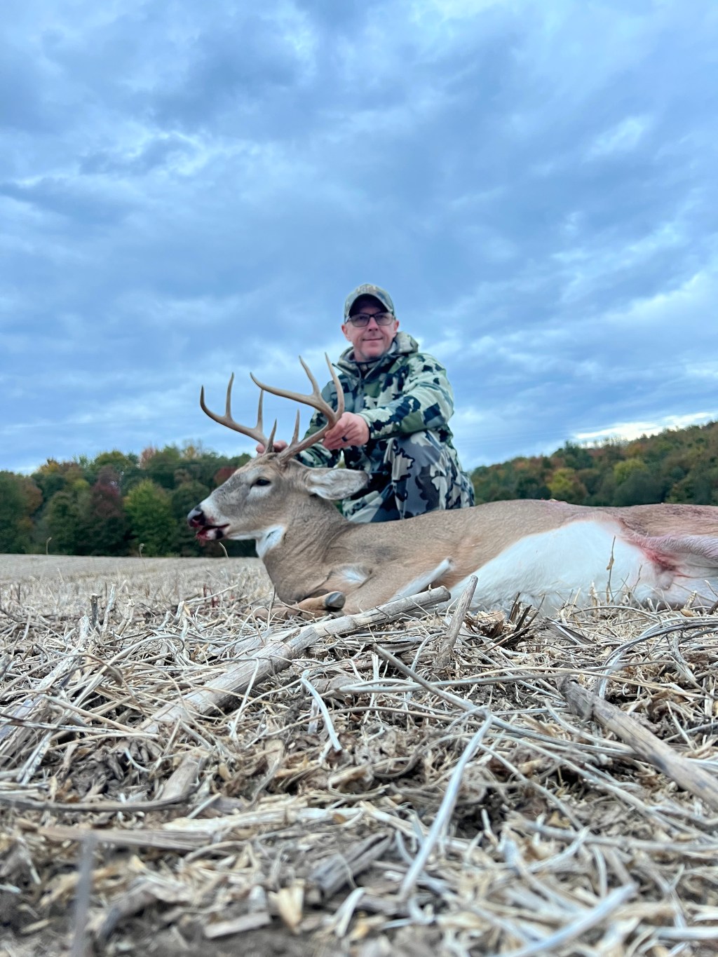 Finally, he turned to leave. I drew back and found a narrow shooting lane through the maples. The arrow found its mark perfectly behind the shoulder, blood visible instantly as he bolted across the cut bean field. I kept my eyes locked on him until he tipped over 200 yards away. A beautiful 8-point and a hunt I’ll never forget.”