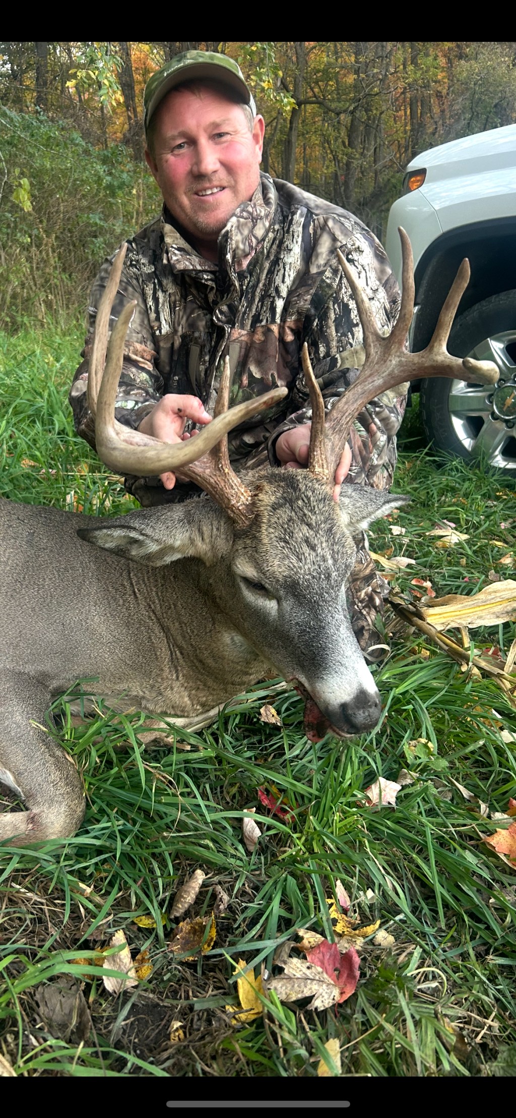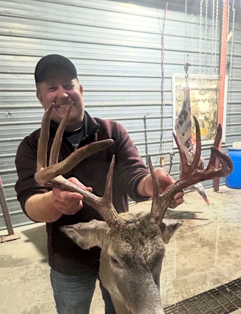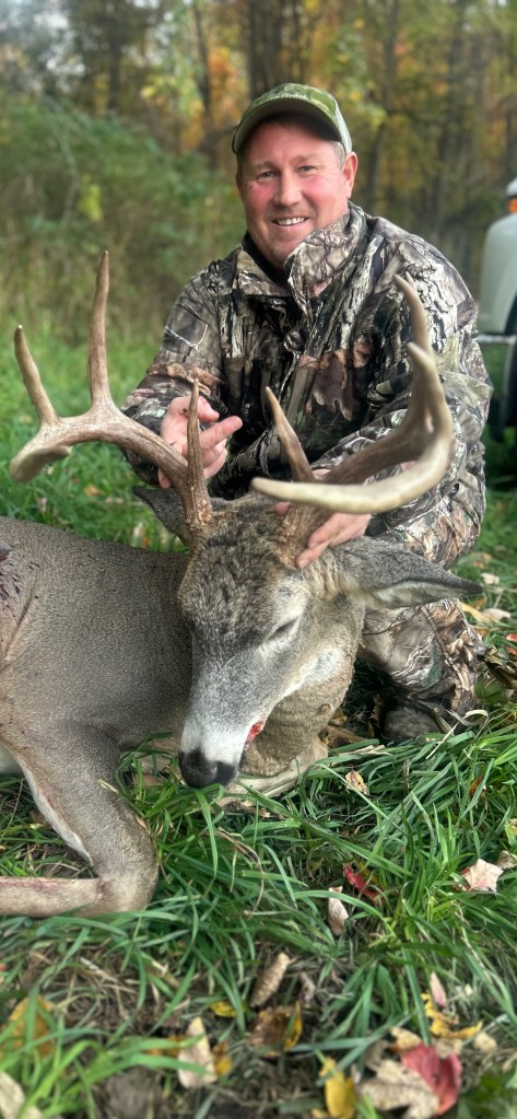 “We’ve been grinding through corn harvest all week, but decided to shut down the machines early yesterday. I got home at 4:45 and figured I’d head to the other farm for an evening hunt, especially since one of my target bucks showed up on camera that morning working a freshly cut cornfield. Running late, I didn’t settle into the stand until 5:10. Almost immediately, a buck emerged and started working scrapes in my direction. As he approached, I realized I’d never seen this deer before. He freshened up a scrape just 15 yards from my stand, and I made the decision to take him. While he wasn’t one of my target bucks, he more than fit the bill when he stepped out – a truly mature buck with incredible mass. He tipped our scale at 229 pounds dressed!”
