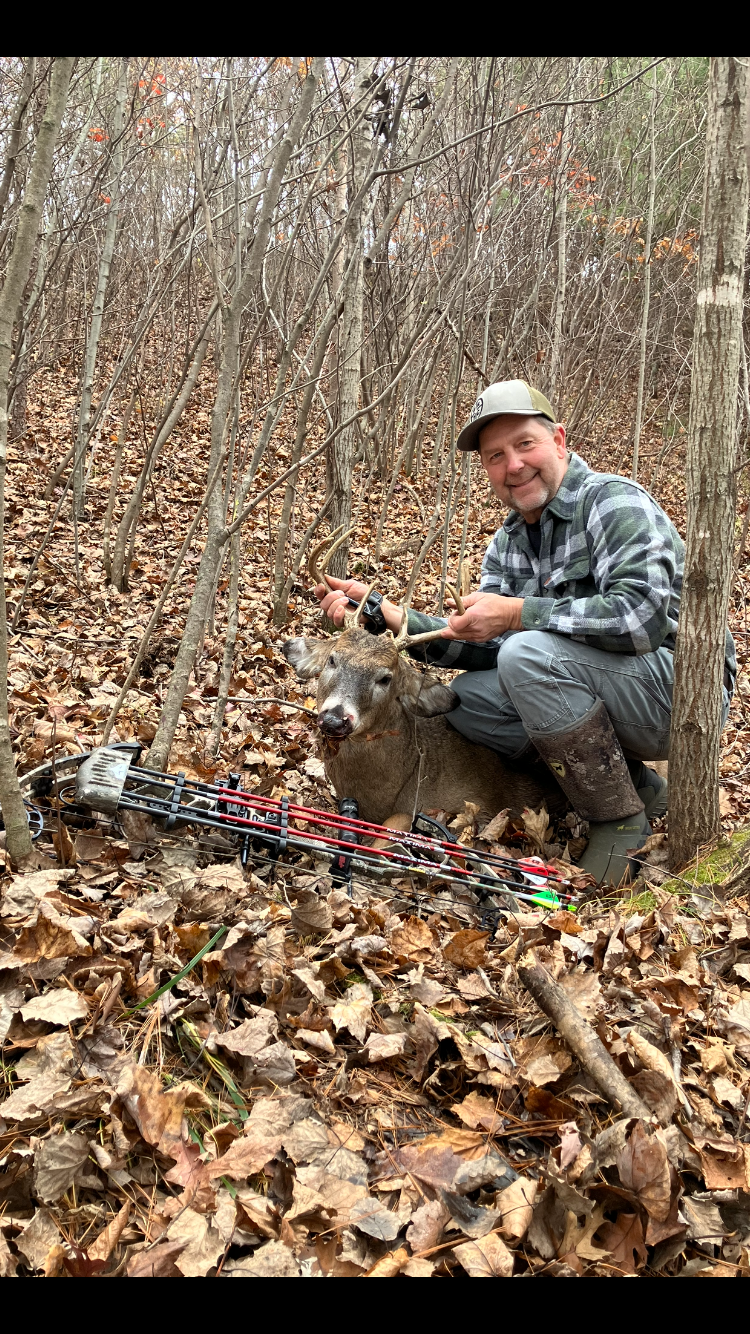 “I snuck into a stand I setup in a bedding area early 10/31/25 . I was disappointed when I heard a few deer running off into the dark as I was about to crawl up to the stand. I went up anyway and stayed put . At 10:30 am this buck came sneaking through. I made a good shot on him at 19 yards in a small shooting lane that I trimmed out . Eight points, 155 lbs dressed on the scale.”