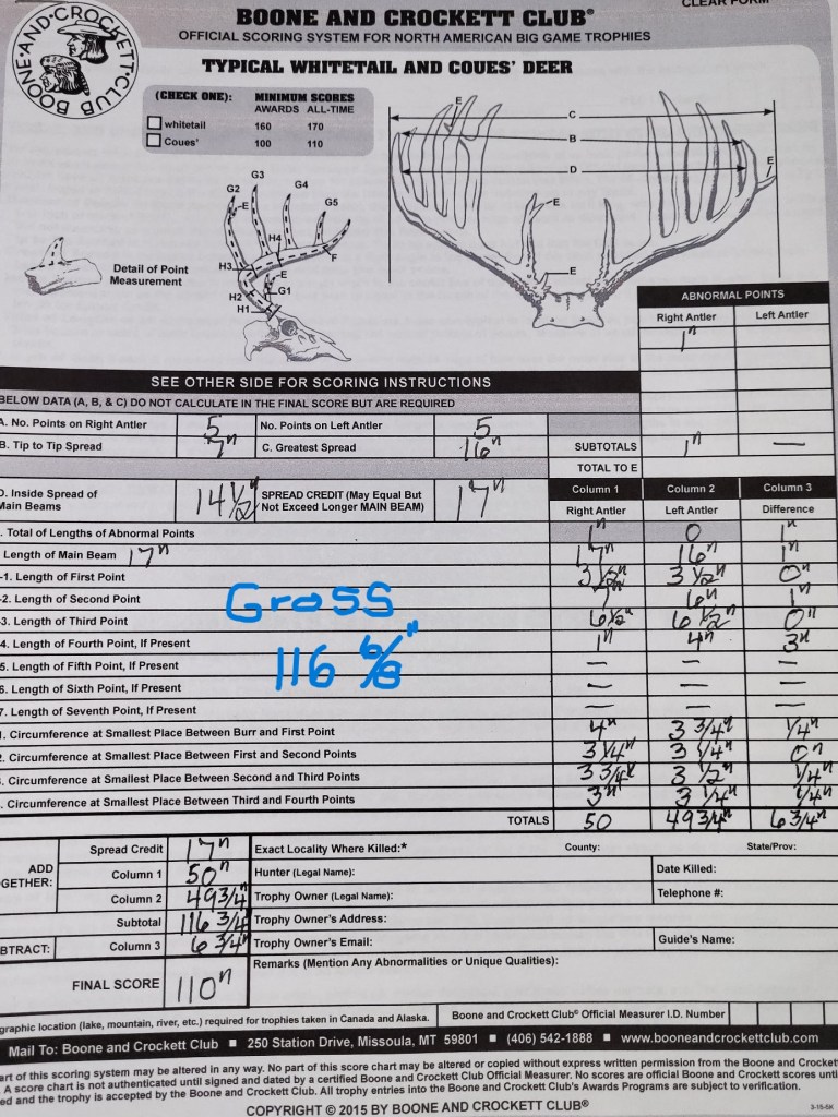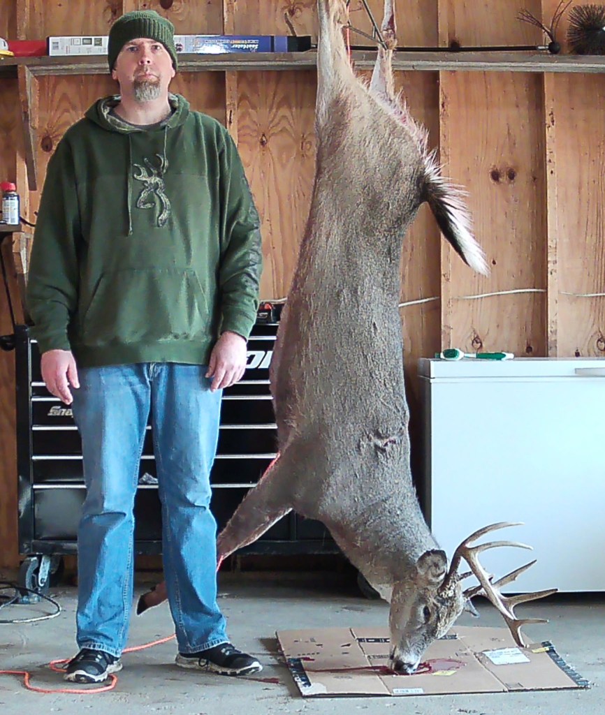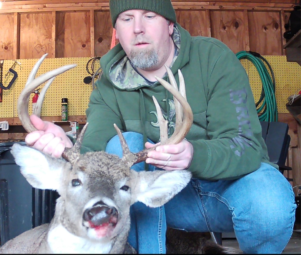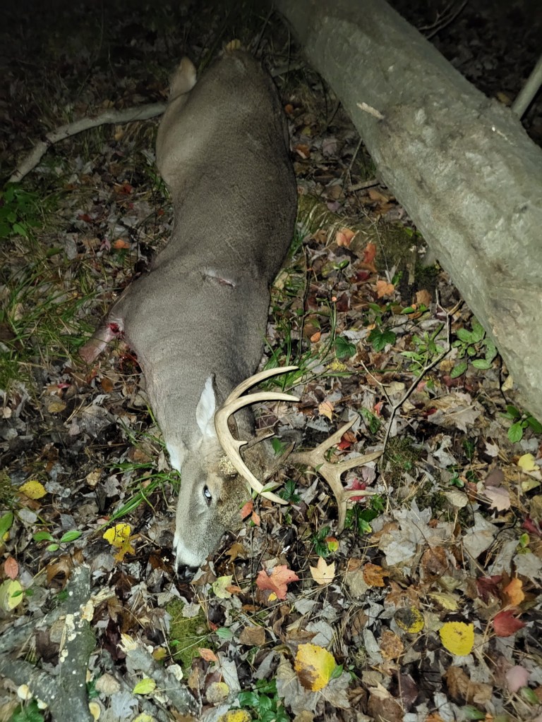 “I hunt on my property in Portage County. I went out last Thursday after work just to see what was happening in the woods, and by no means did I expect to encounter this guy. Around 5:30 I heard a bunch of commotion and saw does running around 75 yards away. I thought I saw a small buck chasing after them. A few minutes later I saw a spike buck heading my way and then about 10 yards behind him was this guy. He got within about 30 yards and then decided to stop and stand behind a tree. His head was sticking out on one side of the tree, so I was able to get a good look at him. He was too nice for me to pass on, so I got ready to take the shot. After what seemed like 10 minutes he took a few steps forward, stopped, stood broadside, and I put a good shot on him. I didn’t see him drop, so I gave him until about dark before I started tracking. He dropped within 40 yards of where I shot him. Got him right in the pump house. I had been watching this buck on my trail cams since early September, and he was the one I was after. This is my personal best buck and the first buck that I harvested at my place since moving in June 2024.