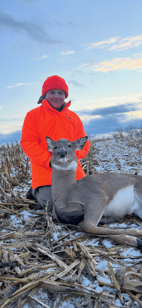 “With the last night of hunting upon us, my youngest child Ryan and i set out. We went to the far north end of our farm as we knew some doe’s were down there. I think the kid was ready to be done as he said he was shooting the first adult deer that came out and I had really no intention of even firing a shot this season as it was about him. Shortly after 4, a fawn appeared and it kept looking back and few minutes later a nice doe came out to the corn field. The kid steadied his rifle and took her. He was tickled and dad was pretty happy! So know I’ll Paul Harvey you with the rest of the story.