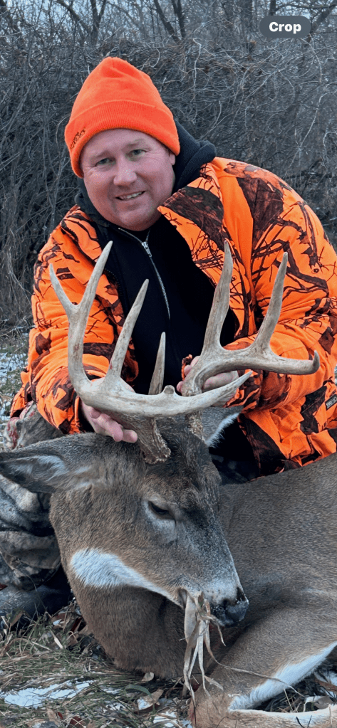 After Ryan’s shot, he got out and I went back to other end to get the ranger. I had unloaded my gun and was carrying our gear. As I got near the other end, a doe came running over hill. So I stopped and loaded my rifle just in case. Well “just in case” came across the field chasing her! I saw the split tine and had to make a quick decision. He came about 100 yards away and I shot. He took off so I gave him 1 more 300 short mag and he fell! Nice buck! Broken brow and a broken tine that both should make 1” or more. We’ll see. 17” spread. Once again thanks for running the pool and the work you do!”