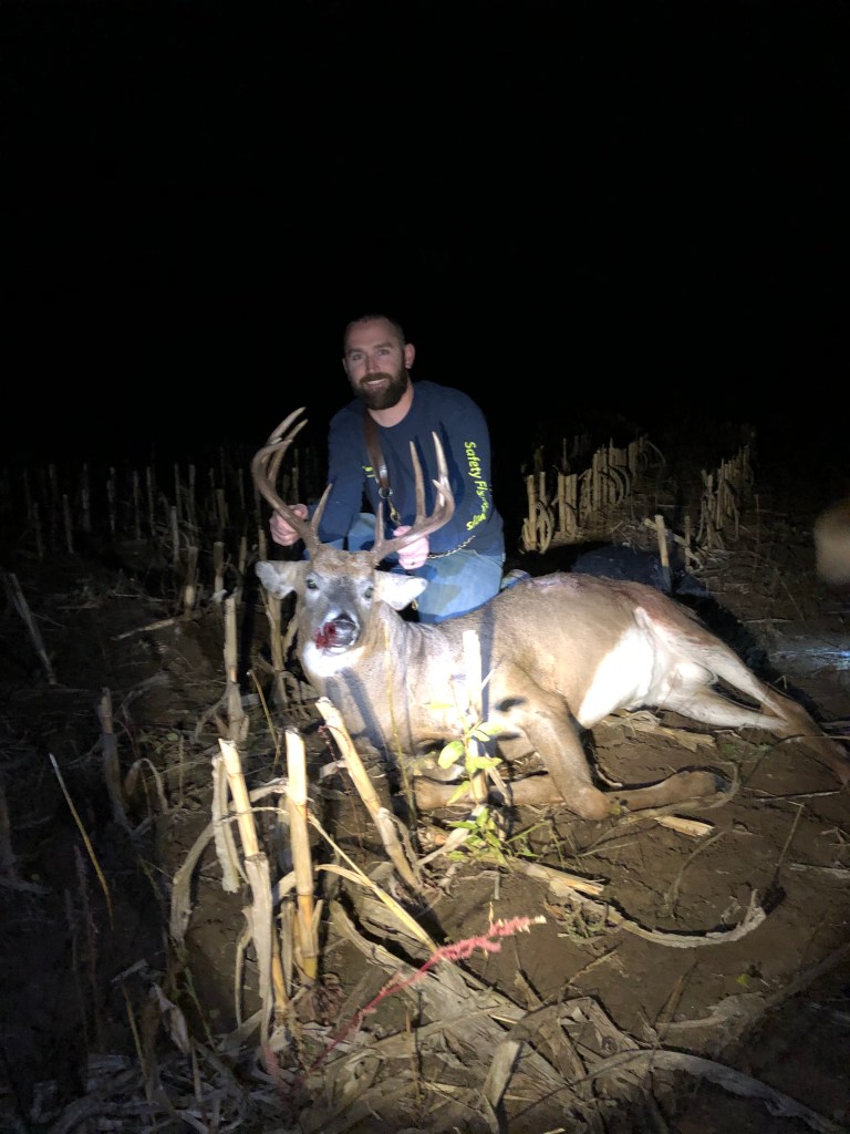 Justin Johnson with his 10 point 16″ spread crop damage buck